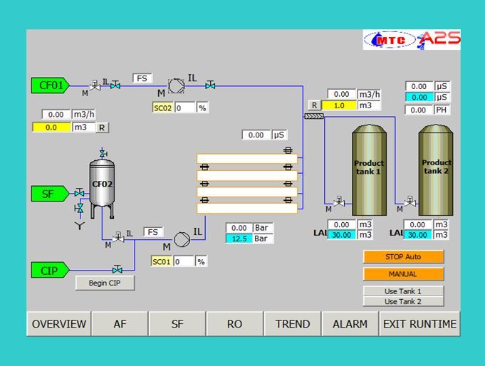 Ở chế độ Auto, hệ RO được chạy tự động theo mức nước trong 2 tank nước nấu bia : tank 1, tank 2. Khi mực nước đạt đến ngưỡng báo cao, hệ thống sẽ tự động dừng đến khi nào mực nước giảm xuống bằng giá trị đặt hệ thống sẽ tự khởi động trở lại, việc giám sát mực nước ở 2 tank này được thực hiện bởi 2 cảm biến báo mức liên tục theo công nghệ thủy tĩnh.